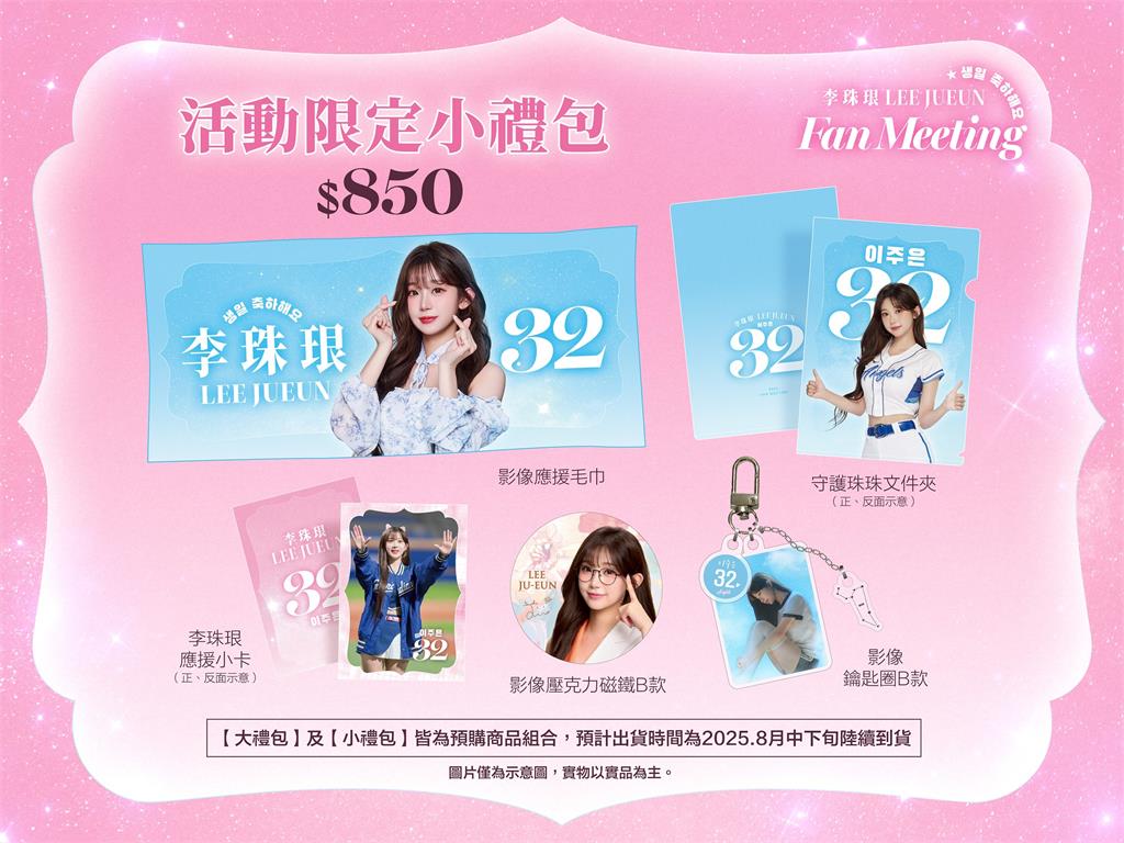 「周邊小禮包」售價為850元,內含李珠珢應援卡、影像應援毛巾、守護珠珠文件夾、影像壓克力磁鐵B款及影像鑰匙圈B款,「頭號粉絲區」粉絲可憑票加購大禮包及小禮包,「最佳應援區」則可加購小禮包,禮包皆為預購商品,預計2025年8月中下旬出貨。