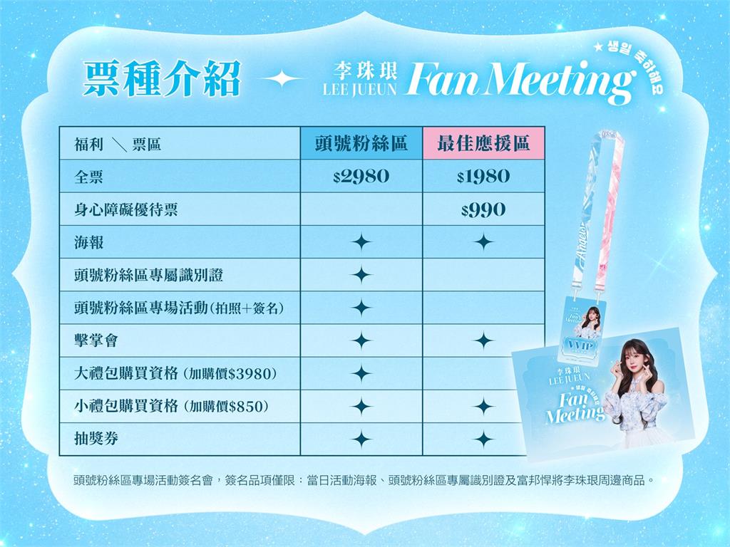 凡購票進場皆可獲得近距離與李珠珢互動的擊掌會,以及生日粉絲見面會專屬海報一張。「頭號粉絲區」更享有提前進場的專屬互動拍照會,活動中的Q&A 問答和專屬抽獎活動,還可獲得VVIP專屬透明夾識別證。
