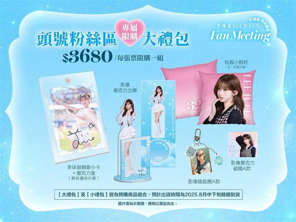 李珠珢生日會票種介紹。圖/富邦悍將棒球隊提供球團也表示,這次李珠珢生日粉絲見面會還將推出周邊系列商品,只限參與本次粉絲見面會的粉絲朋友可以憑票加價預購,「周邊大禮包」售價為3,680元,內含李珠珢生日會李珠珢親簽紀念卡(含卡套)、私服小抱枕、影像壓克力立牌、影像壓克力磁鐵A款及影像鑰匙圈A款。