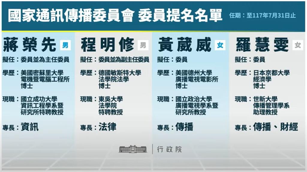 NCC主委已經懸缺一年,行政院今(31)天公布提名國家通訊傳播委員會委員人選,分別是成功大學資工系教授蔣榮先、東吳大學法學院特聘教授程明修,還有政大廣電系教授黃葳威,以及世新大學傳管系助理教授羅慧雯等四人。其中新主委由「蔣榮先」出線,副主委則是「程明修」。行政院也希望立法院儘早依法審查,以利運作。國家通訊傳播委員提名名單。圖/行政院提供責任編輯/蔡尚晉