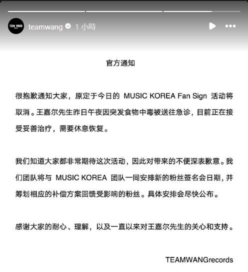 公司TEAM WANG公告表示,王嘉爾昨天深夜因為突發食物中毒被送往急診,目前正在接受妥善治療,需要休息恢復,因此只能遺憾取消這次活動,並為突然的取消向粉絲道歉,也承諾將會與MUSIC KOREA Fan Sign的團隊一同安排日後新的簽名會行程,籌劃相關補償方案回饋受到影響的粉絲。
