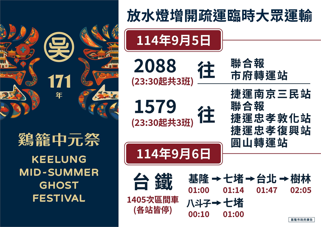 增開大眾運輸班次。圖/基隆市政府基隆市政府提醒,迎斗燈與放水燈遊行皆屬中元祭重要科儀,活動期間市區車流與人潮將相當擁擠,請民眾盡量搭乘大眾運輸工具,並遵守交通管制及現場警察指揮,維護城市秩序與活動安全。