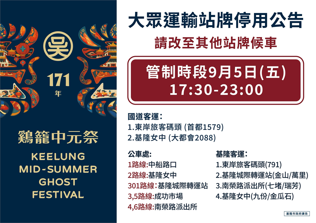 大眾運輸站牌停用公告。圖/基隆市政府市區公車改道部分,中正區路線於中正路/中船路口(南口)自來水公司對面設置臨時站牌折返,信義區路線於東信路/正信路旺牛橋基隆女中站折返,中山區(除301於中山一路忠一路口迴轉外)、安樂區路線於成功市場站折返(不停城際轉運站),七堵區、暖暖區路線於南榮路/曲水街口三坑站設置臨時站牌折返。