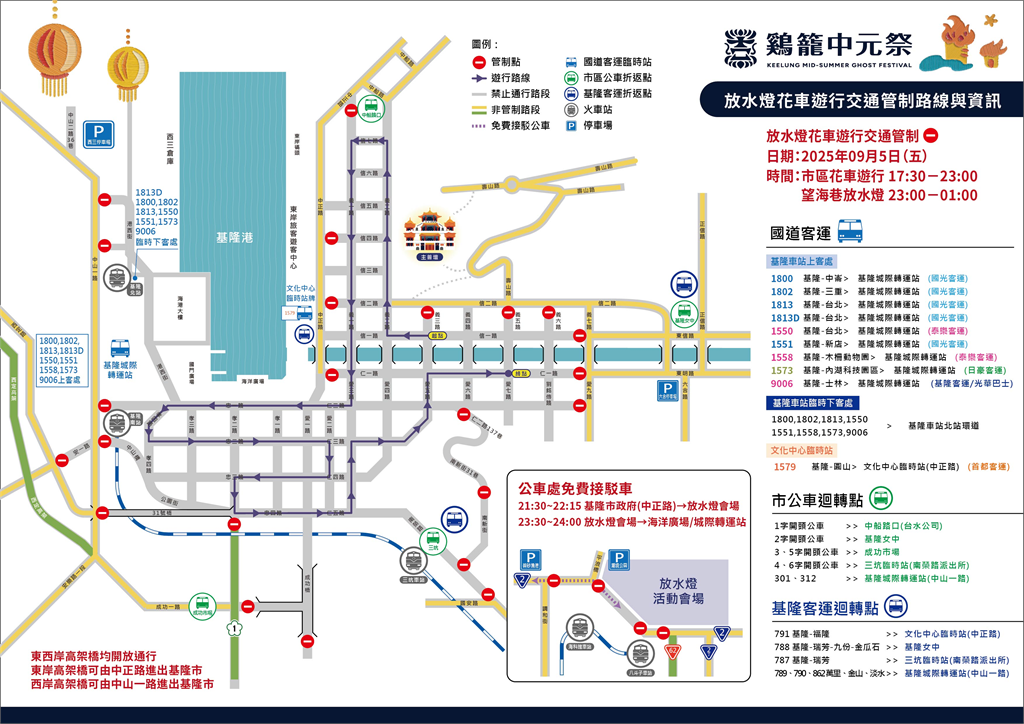 至於望海巷放水燈交通管制部分,交管時間為9月5日21時至翌日(6日)1時,管制路段於臺2線自平浪橋頭(潮境公園旁,離調和街約500公尺)至八斗子車站(約為基隆市、新北市市界)路段雙向管制,除大眾運輸客運車輛、管制範圍內居民車輛憑證件及持有工作人員通行證外,所有車輛禁止進出。