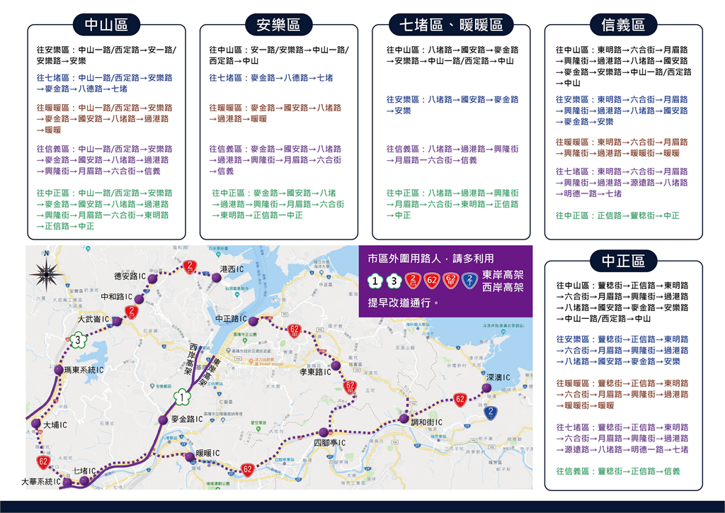 替代道路圖。圖/基隆市政府提供國道客運改道部分,1579路線將於中正路雙向(文化中心旁及飛鳶廣場)設置臨時站牌供民眾搭乘;2088路線區間車改道行駛台62甲線經孝東路至基隆女中站返程,八斗子全程車改道行駛台62甲線經孝東路、深溪路至海科館站;其餘國道客運路線於火車站北站前下車,城際轉運站上車,請注意各客運公司公告。