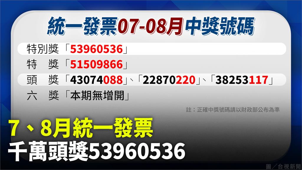 財政部今(25)日公開「114年7-8月統一發票」中獎號碼,千萬元特別獎的獎號為「53960536」,200萬特獎的獎號為「51509866」。領獎期間自114年10月06日起至115年01月05日止。