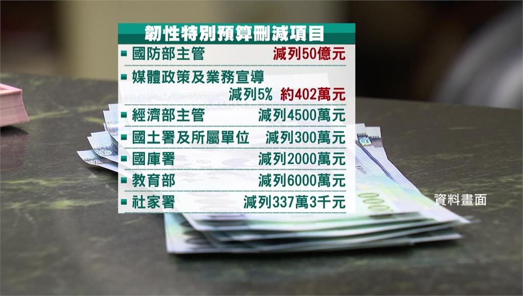 不過韌性特別預算中,還是有部分項目藍白黨團不願輕易放行,嚴格把關媒體宣傳費用,經濟部、勞動部、衛福部等部會的媒宣項目,都被減列5%;刪減細項中更以國防部主管業務最多,遭減列50億元,國民黨立委馬文君強調,國防部編列的金額最高,甚至比受到關稅戰影響要協助的產業以及提升競爭力的預算還要高。