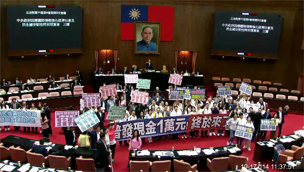 包含普發一萬經費的「韌性特別預算」週五在立院三讀通過,等不及院長韓國瑜敲槌,朝野立委先搶著在台下舉手牌合照。圖/翻攝自IVOD