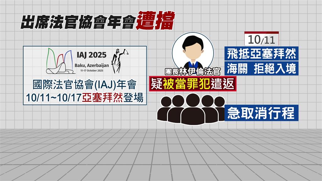 11日開幕的「國際法官協會」(IAJ)2025年會,傳出中國再度打壓台灣外交空間。我國法官協會原訂派出6位代表前往亞塞拜然參與會議,履行會員國權利與義務,沒想到代表團團長、高等法院林伊倫法官在開幕當日抵達當地時,遭亞塞拜然海關拒絕入境,甚至疑似被當作罪犯遣返。