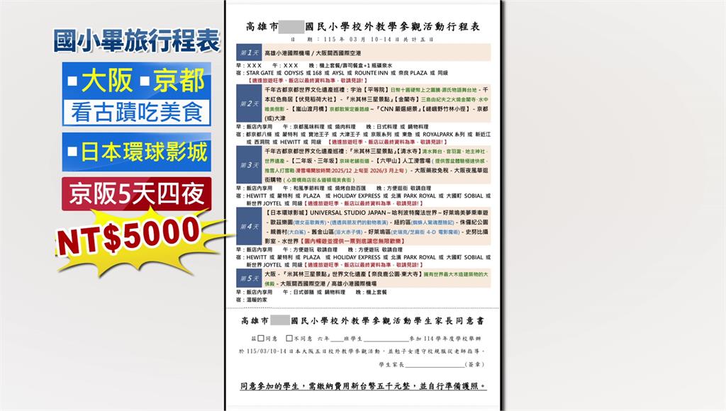 穿著和服漫步京都街頭,又或是跟一群朋友衝環球影城,日本大阪京都是國人愛去旅遊地,這夢幻行程竟然也是國小某班級的畢業旅行。家長秀出孩子畢旅行程表,飛大阪京都看古蹟吃美食,再去環球影城,整趟旅程5天四夜,竟然只要五千元。