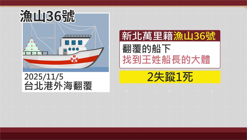 至於5號發生翻覆的新北萬里籍「漁山36號」,漁船家屬於6號晚間11點多請專業潛水員協助尋找,終於在翻覆的船下發現王姓船長的遺體,但仍有兩名船員下落不明。