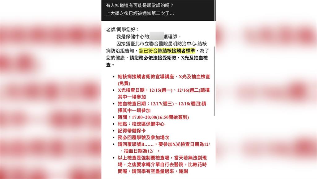 北市衛生局表示,與學校已安排並通知接觸者參加衛生教育及胸部X光等相關檢查,也呼籲接觸者接獲通知後,務必依時程完成檢查,如因故無法配合檢查時程,可洽學校保健中心或衛生單位開立轉介單,再持轉介單自行至醫療院所接受檢查。