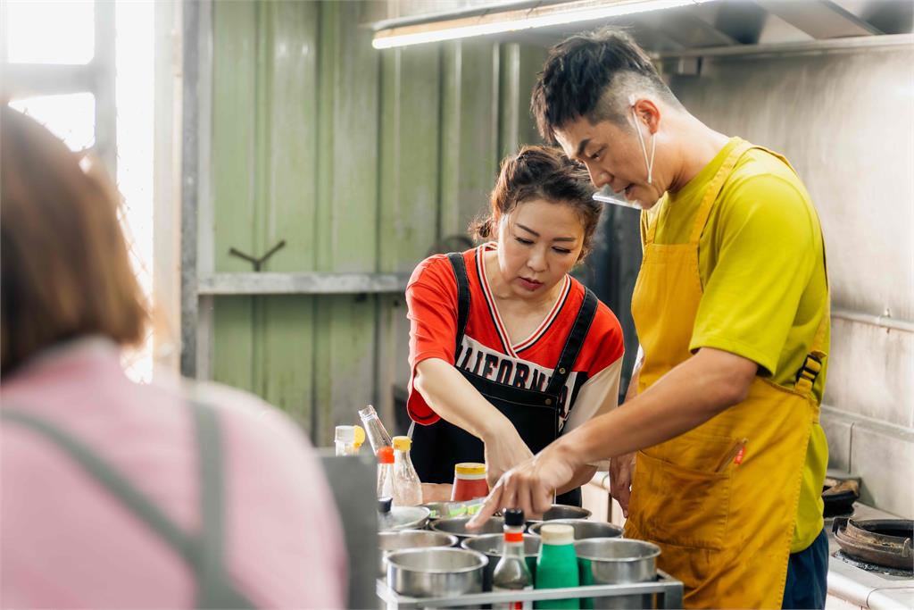 本集節目迎來「辣妹駕到」張秀卿(左)擔任大來賓。圖/好看娛樂夥伴們在準備經典臺南料理時同樣遭遇一連串考驗。其中滑蛋蝦仁被嫌味道太淡,而原本自信完成的魚頭料理,卻因魚鱗未處理乾淨被當場打槍。即便莎莎急忙解釋:「我們在臺南吃魚頭有鱗片是正常啦!」仍難敵專業標準,被判定不夠細緻。張秀卿隨即「究責」站在一旁的郭泓志,追問:「為什麼沒有把魚鱗處理好?」現場笑聲不斷。