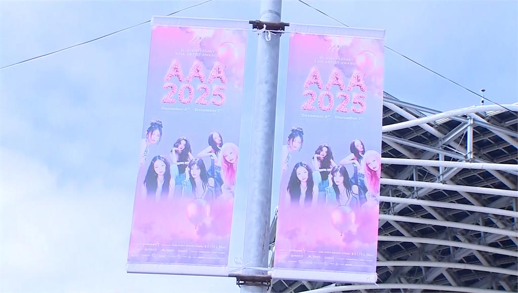 結合韓國流行音樂以及韓劇為主的韓國AAA典禮首度移師高雄世運,一早場外已經能聽到彩排的聲音,現場也掛滿粉紅旗幟,上頭都是偶像,粉絲也迫不及待擺拍朝聖,有CORTIS粉絲透露昨天去接機,雖然滿遠的,但看到的時候有哭。