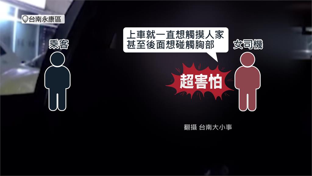 事發在台南永康區,男乘客深夜搭計程車回家,一上車就坐上副駕駛位,行駛過程中還不時伸出手靠近女司機,甚至還想碰觸胸部,讓女司機超害怕,連喊三次「不要碰我」,並想趕快到達目的地放對方下車。
