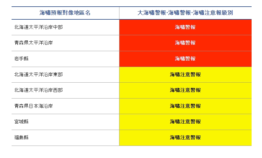 日本氣象廳發布海嘯警報、海嘯注意警報。圖/翻攝自日本氣象廳