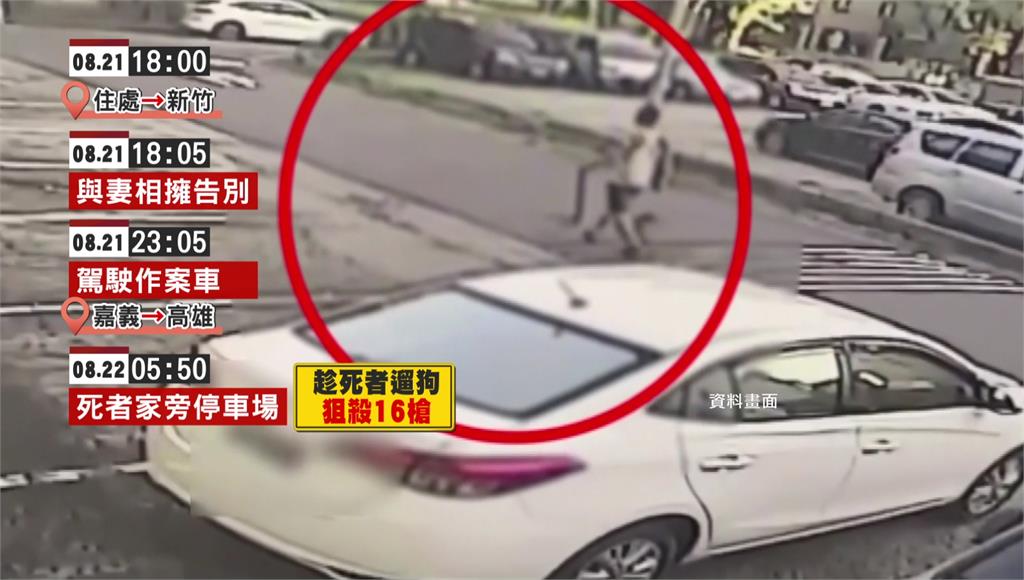 整起案件背後早有預謀行動縝密。圖/台視新聞做案前一天,槍手從家中出發,搭乘白牌車到新竹,途中還停車與妻子相擁告別;之後再前往嘉義取得作案車,開往高雄左營。案發當天清晨5點多,槍手抵達死者家附近的停車場待命,等死者出門遛狗時,隨即狂轟16槍將其狙殺。