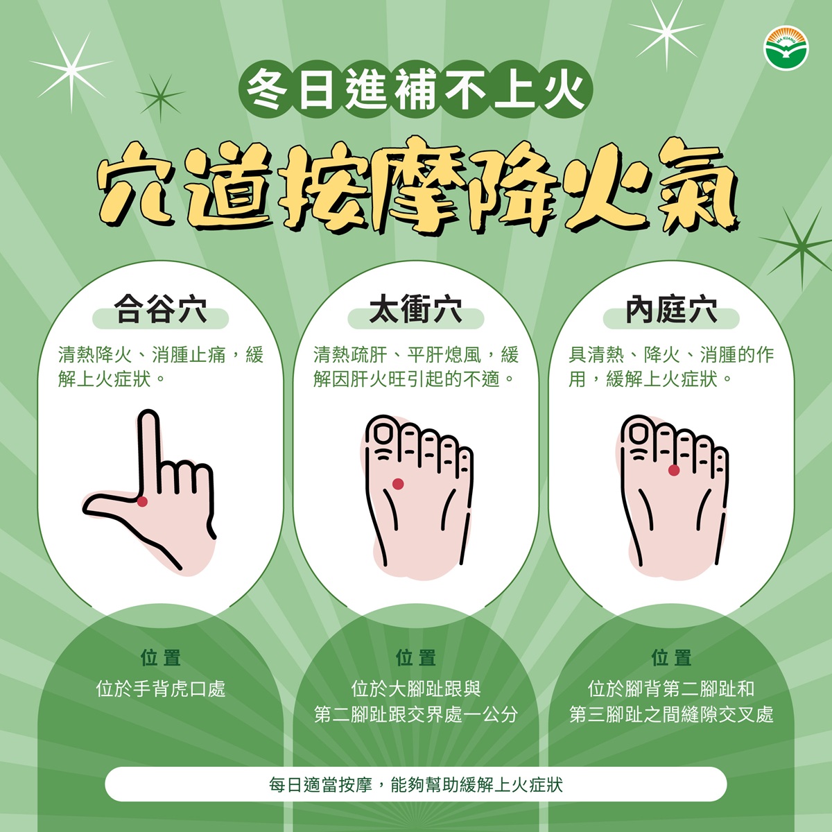 此外,餐後飲用茶飲,也有助緩解熱氣:像是冬瓜皮茶能清熱退火,菊花茶+枸杞,可以緩解上火,洛神荷葉茶能消脹、解煩熱。另外,按摩穴位也能降火氣,潘韋岳師推薦三個穴位,可改善上火不適: