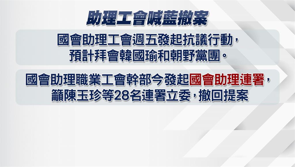 國會助理工會將於週五向立法院長韓國瑜陳情,並在議場前發起抗議行動,工會現在也發起連署,呼籲藍委撤回提案。