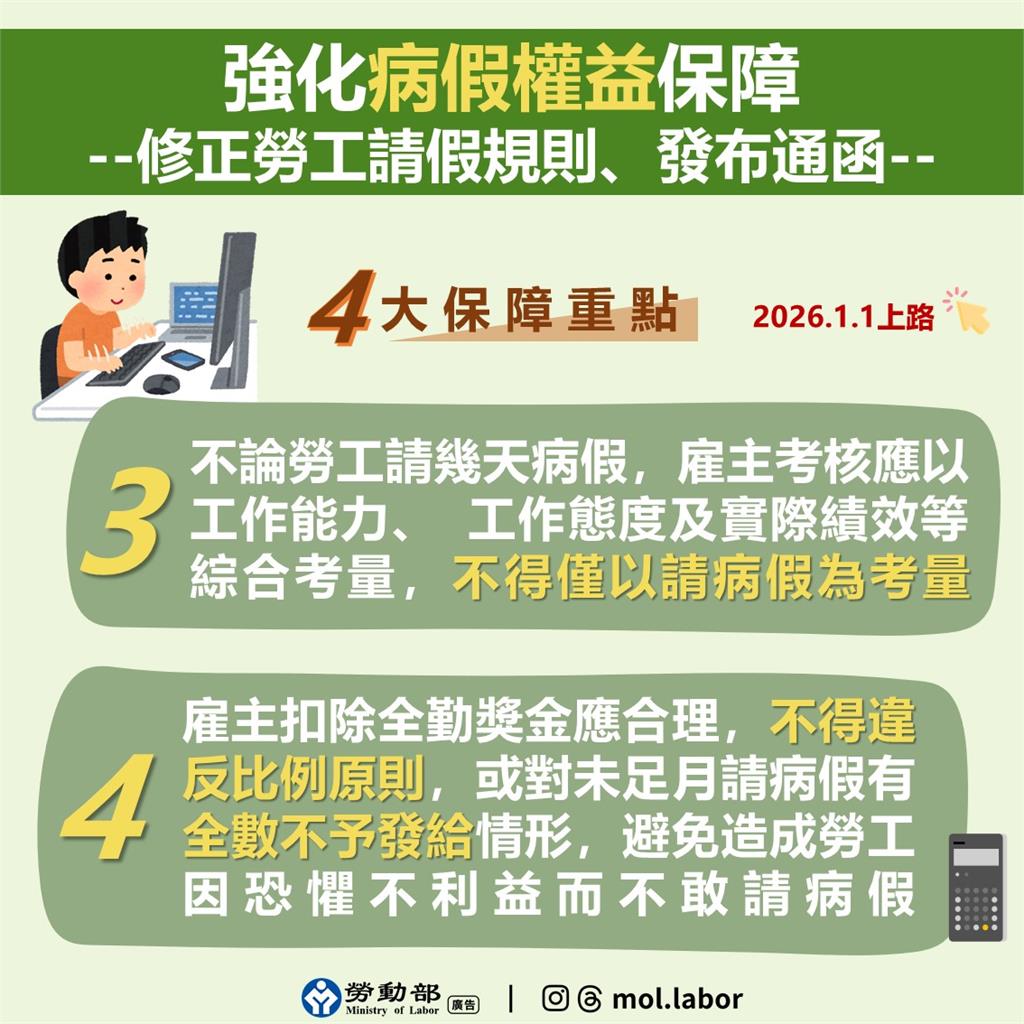 勞動部修正修正《勞工請假規則》。圖/勞動部提供針對病假部分,法規增訂勞工一年內請普通傷病假日數未超過10天者,雇主不得因勞工請普通傷病假而有不利處分;而如果超出10天,雇主進行相關人事考核時,仍應以其工作能力、工作態度及實際績效等綜合考量,雇主不得僅以請假天數作為考核依據。