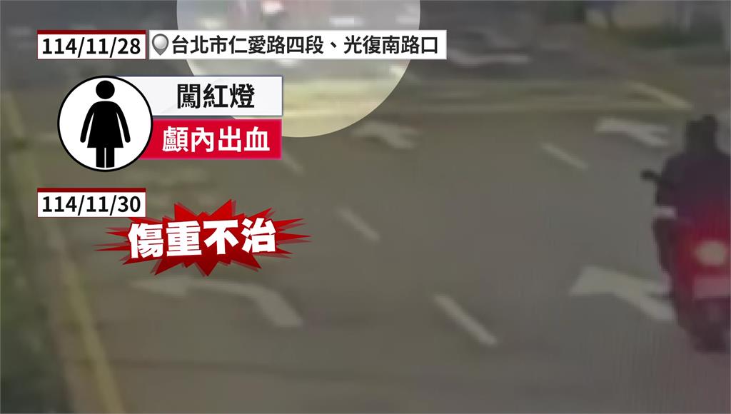 台北市仁愛路四段、光復南路口,日前發生一起嚴重車禍,一名趕著上班的員警騎機車經過路口時,遇到一名闖紅燈過馬路的82歲婦人,結果騎士閃避不及當場撞上,兩人重摔倒地後送醫。騎車的員警手腳擦挫傷,但婦人傷勢嚴重顱內出血,經過兩天搶救後,仍傷重不治。
