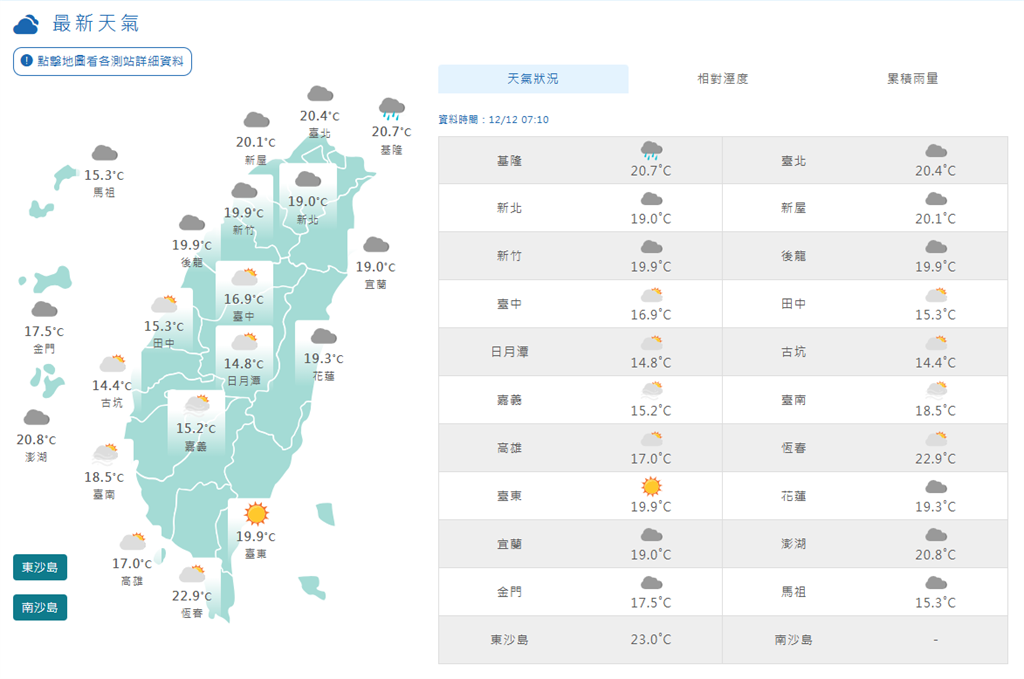 12/12全台天氣預報。圖/中央氣象署氣溫方面,西半部及東北部低溫約15至18度,花、東低溫約19度,清晨局部近山區平地及沿海、空曠地區因輻射冷卻影響,溫度可能更低一些,至於白天高溫,預測北部、東北部及東部約21至24度,整日較濕涼,其他地區仍可達26至28度,中南部日夜溫差較大,早出晚歸的朋友應注意添加衣物以免受涼。