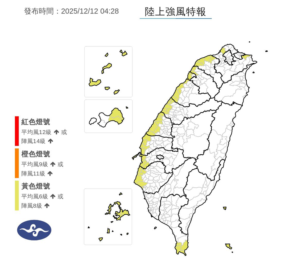 此外,由於東北風偏強,台南至桃園、基隆北海岸、恆春半島沿海及各離島,易有平均風6級以上或陣風8級以上的強風發生,海邊活動請多留意安全。