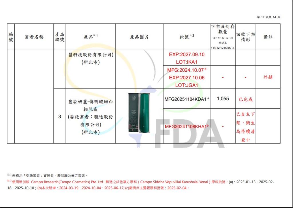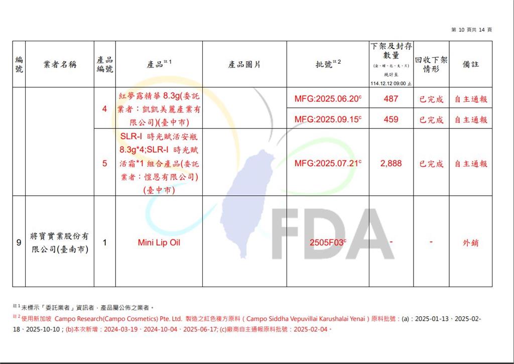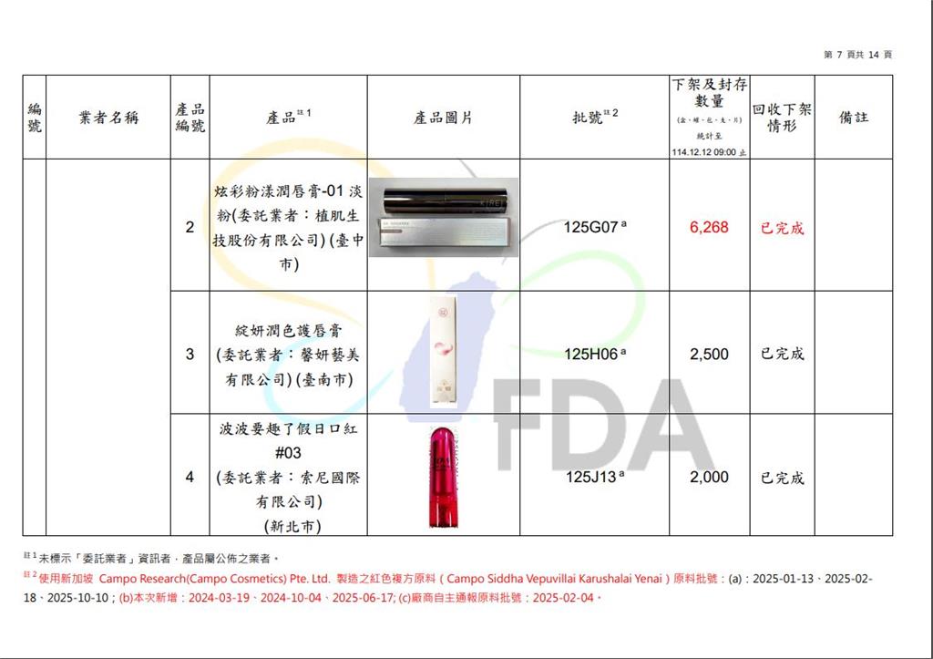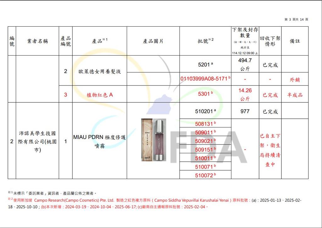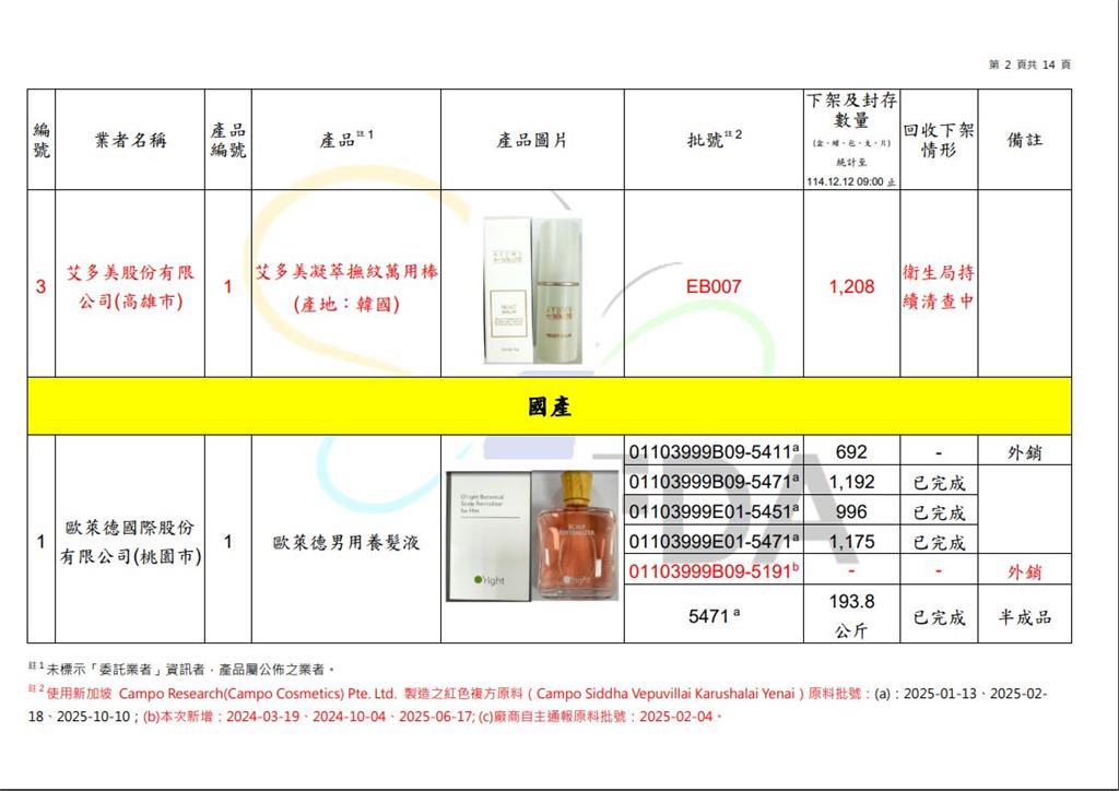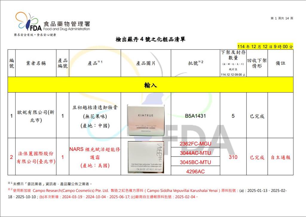 化妝品蘇丹色素案再新增18個品項!食藥署持續追查化妝品輸入原料含禁用色素「蘇丹4號」事件,今(12)天公布最新查核結果,新增2項輸入化妝品,其中1項是衛生局自艾多美股份有限公司抽樣,由韓國製造且仍在國內流通的「艾多美凝萃撫紋萬用棒」,經食藥署檢出禁用色素蘇丹4號,已要求全面下架並不得販售,後續將由衛生局裁處。另1項是法徠麗股份有限公司,主動通報由美國製造的「NARS裸光賦活超能修護霜」自主檢出蘇丹4號,已主動下架回收。另外也新增國產16個品項,都是亦鴻公司下游業者問題原料製造的產品,已自主下架。化妝品蘇丹色素案再新增18個品項。圖/食藥署提供責任編輯/網路中心