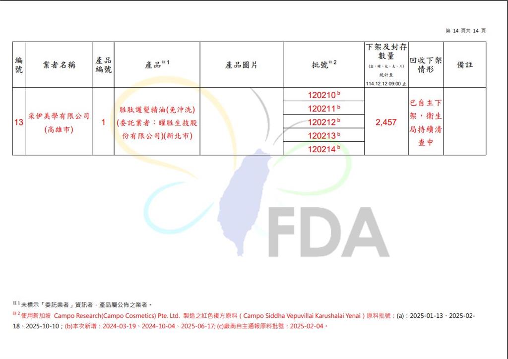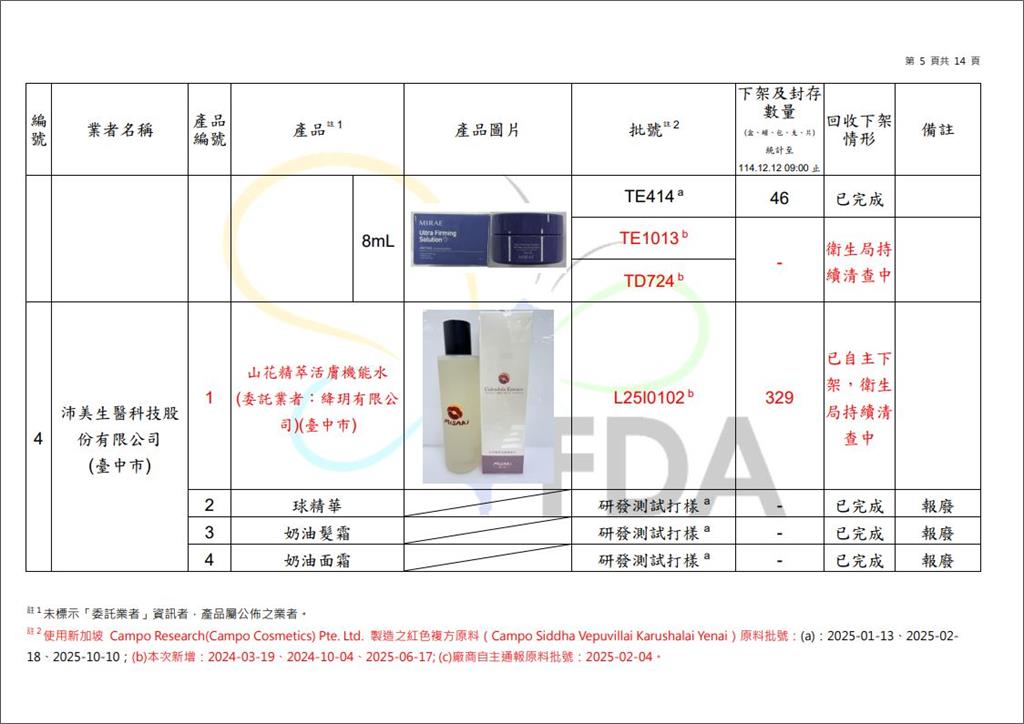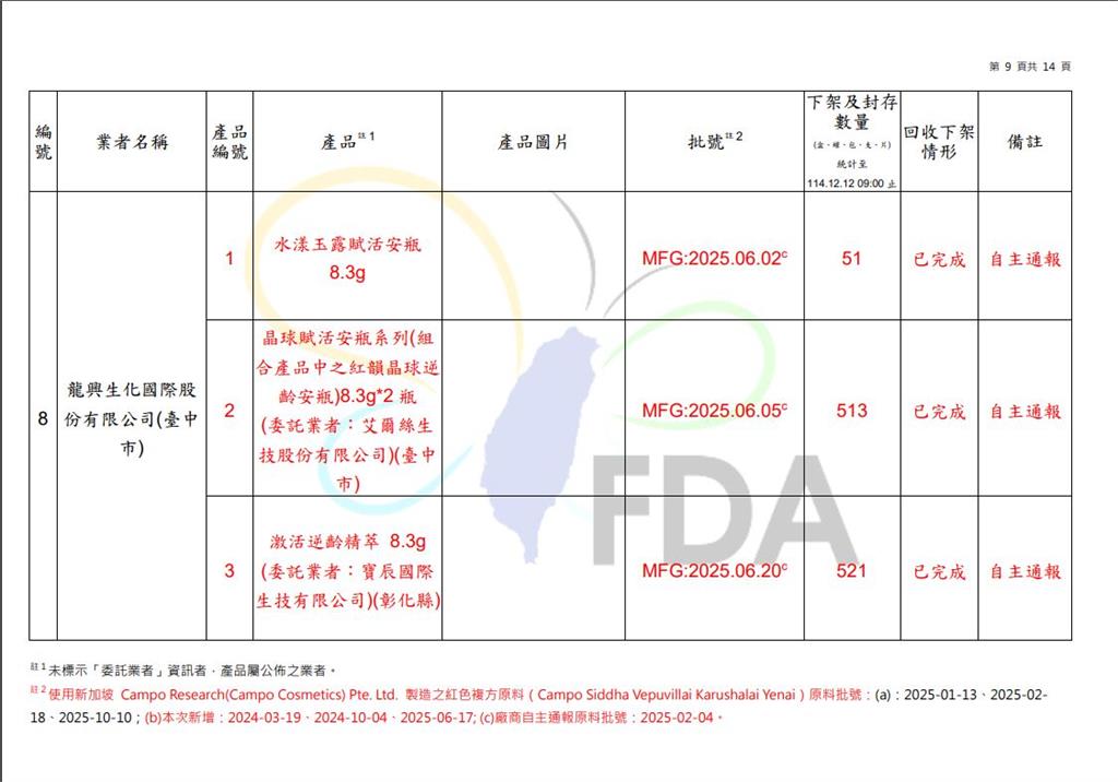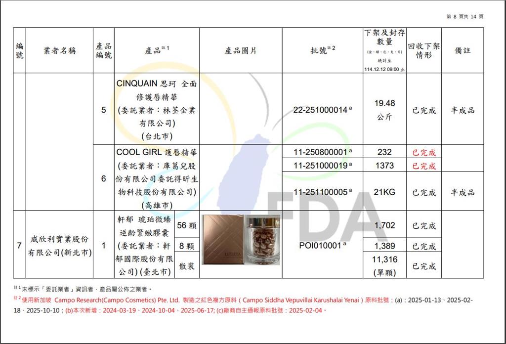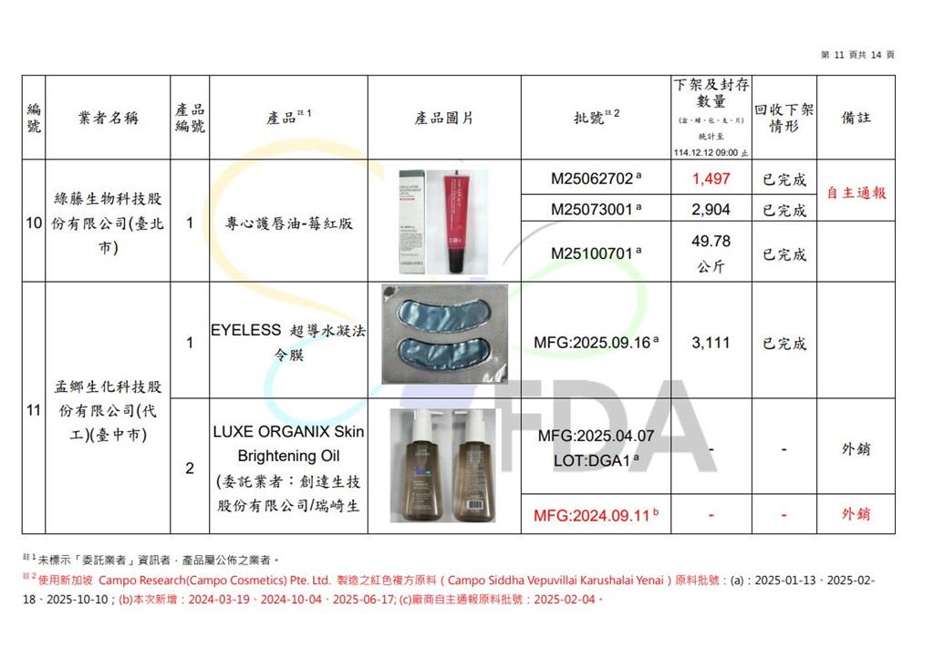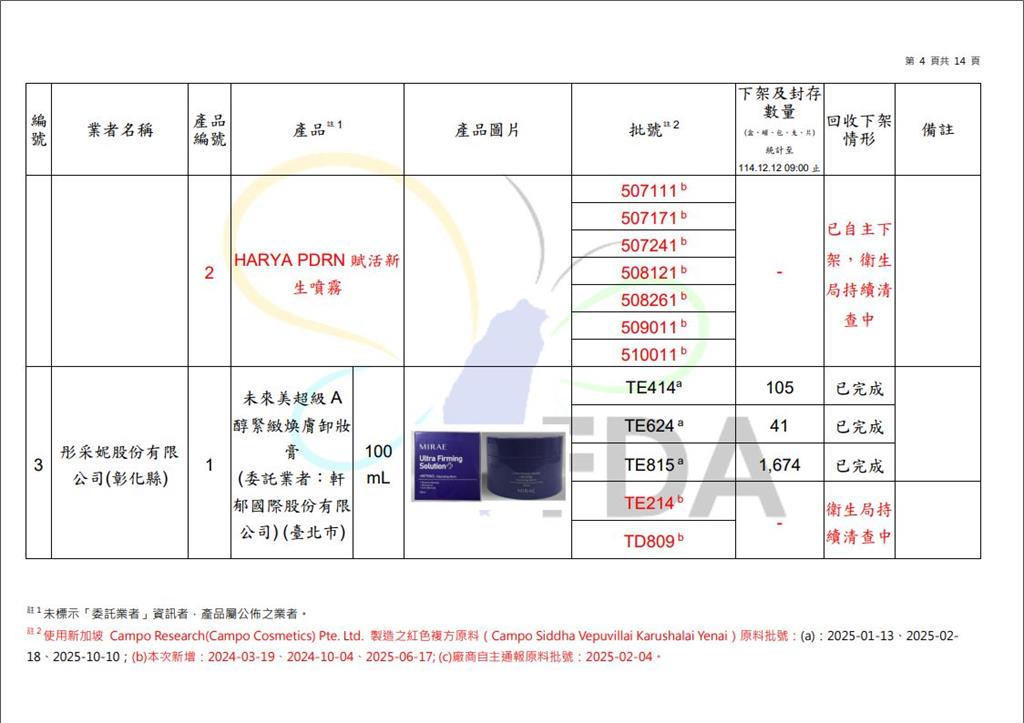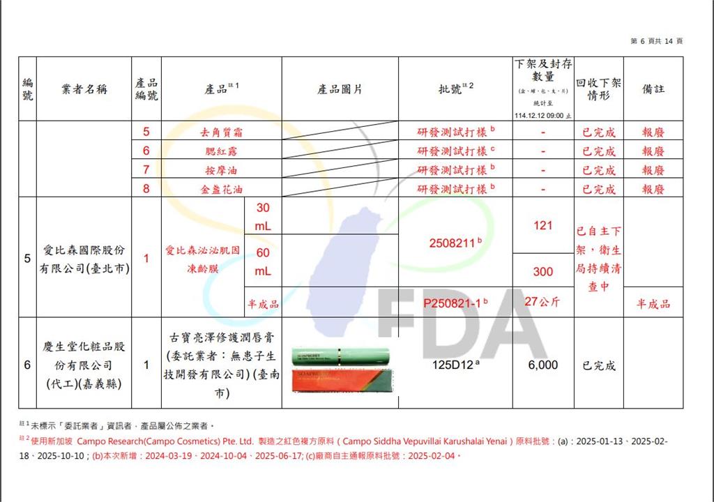 化妝品蘇丹色素案再新增18個品項!食藥署持續追查化妝品輸入原料含禁用色素「蘇丹4號」事件,今(12)天公布最新查核結果,新增2項輸入化妝品,其中1項是衛生局自艾多美股份有限公司抽樣,由韓國製造且仍在國內流通的「艾多美凝萃撫紋萬用棒」,經食藥署檢出禁用色素蘇丹4號,已要求全面下架並不得販售,後續將由衛生局裁處。另1項是法徠麗股份有限公司,主動通報由美國製造的「NARS裸光賦活超能修護霜」自主檢出蘇丹4號,已主動下架回收。另外也新增國產16個品項,都是亦鴻公司下游業者問題原料製造的產品,已自主下架。化妝品蘇丹色素案再新增18個品項。圖/食藥署提供責任編輯/網路中心