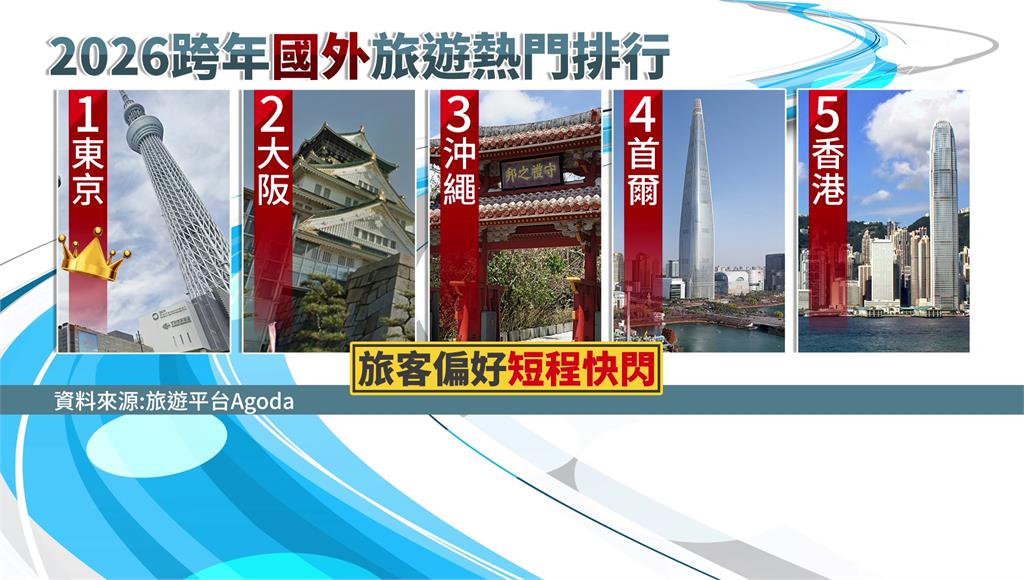 只剩下半個月就要邁入2026年,大家已經安排好要如何跨年了嗎?旅遊平台統計出2026年跨年旅遊熱門排行榜,以國外旅遊來看,第一名是東京,第二名大阪,第三名沖繩,前三名皆由日本城市包辦;接下來依序為首爾與香港,顯示旅客偏好短程快閃之旅。