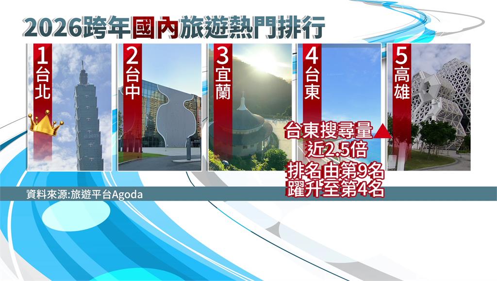 2025年進入尾聲,旅遊平台公布2026年跨年旅遊排行榜,國外旅遊前3名城市分別為東京、大阪、沖繩;而國旅方面,「台東」則成為最亮眼的黑馬,搜尋量成長近2.5倍。旅遊平台推測,除了山海景觀與慢活步調外,天后張惠妹將重返台東跨年晚會開唱,也可能是推升關注度的因素之一。
