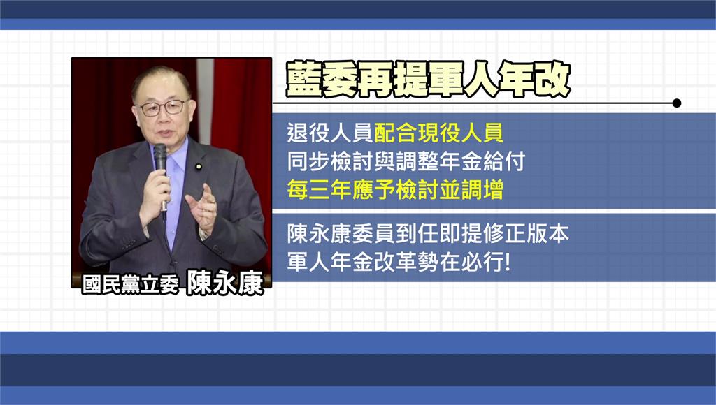 上週五立院藍白挾人數優勢,三讀通過「退休公教停砍年金」。即便掀起不少輿論反彈,挨轟讓年改走回頭路。國民黨軍系立委陳永康卻再出招,研擬讓退役軍人年金福利也跟上。他指出,「軍人不是職業,軍人是志業」,因此退伍與在職人員都應該享受同樣待遇。