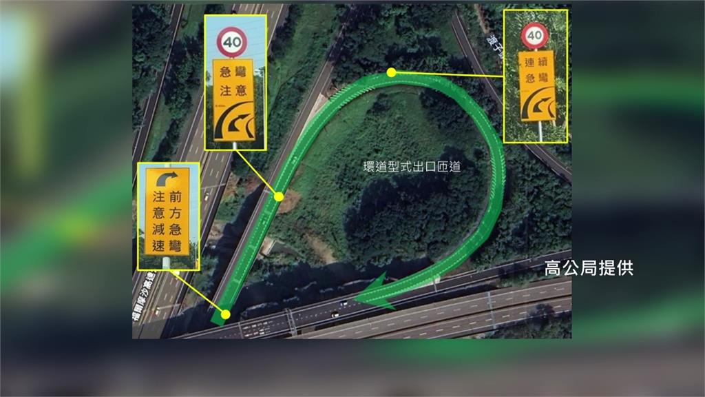 高公局指出,為降低匝環道事故風險,出口匝環道彎道路段已設置速限標誌、彎路標誌及安全方向導引標誌,同時加密路面標記,並在路肩劃設白色斜紋線,強化視覺提醒。