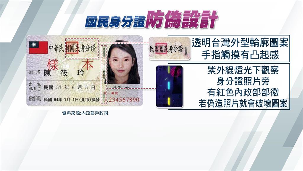 國民身分證防偽設計。圖/台視新聞製圖台科大資通安全研究與教學中心主任查士朝表示,每一種防偽機制可能都需要不同設備,相對而言,偽造成本就會提高;透過各種不同的驗證方式,成功偽造的機率也會隨之降低。