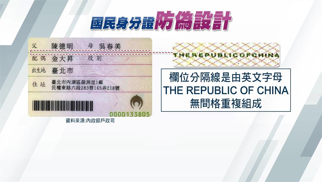 國民身分證上有十多種不同的防偽設計,最近有民眾發現,身分證上的欄位分隔線,其實是由中華民國的英文「THE REPUBLIC OF CHINA」以無間隔方式重複組成,這項冷知識也在網路上引發討論。其實,身分證上還有許多不同層次的防偽設計,專家指出,這是為了提高偽造的成本與難度。