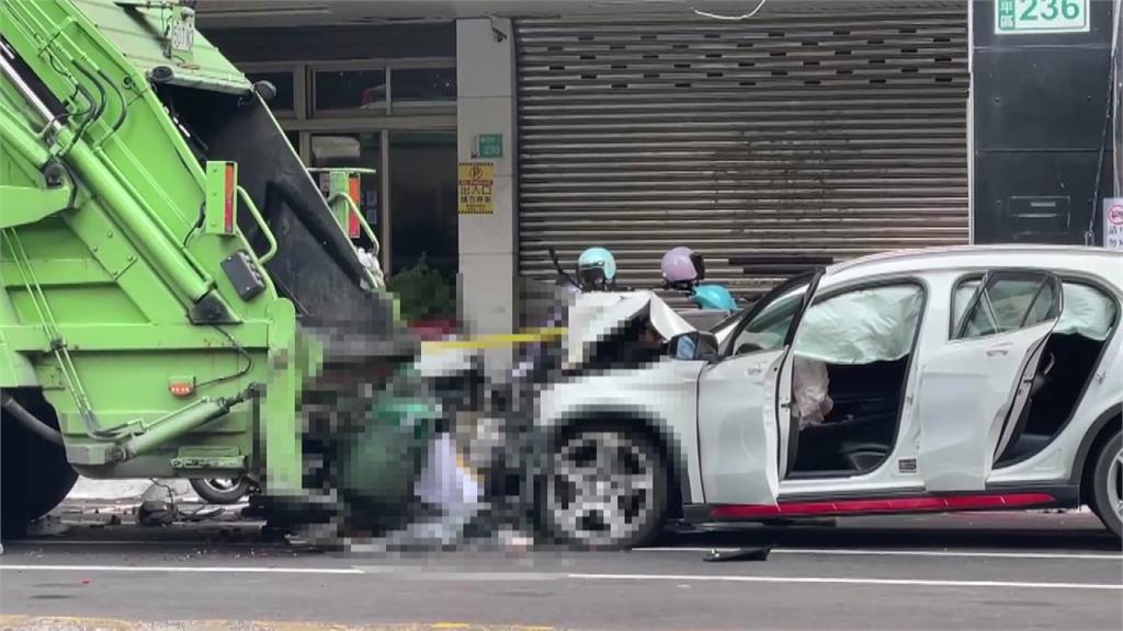 女清潔員今天上午8時許,站在垃圾車旁邊正協助清理作業,沒想到一輛白色賓士從後方高速撞擊,女子瞬間遭夾擊,當場死亡。肇事賓士車頭全毀,垃圾車廚餘桶、後車斗也通通撞到破裂,可見撞擊力有多猛烈。