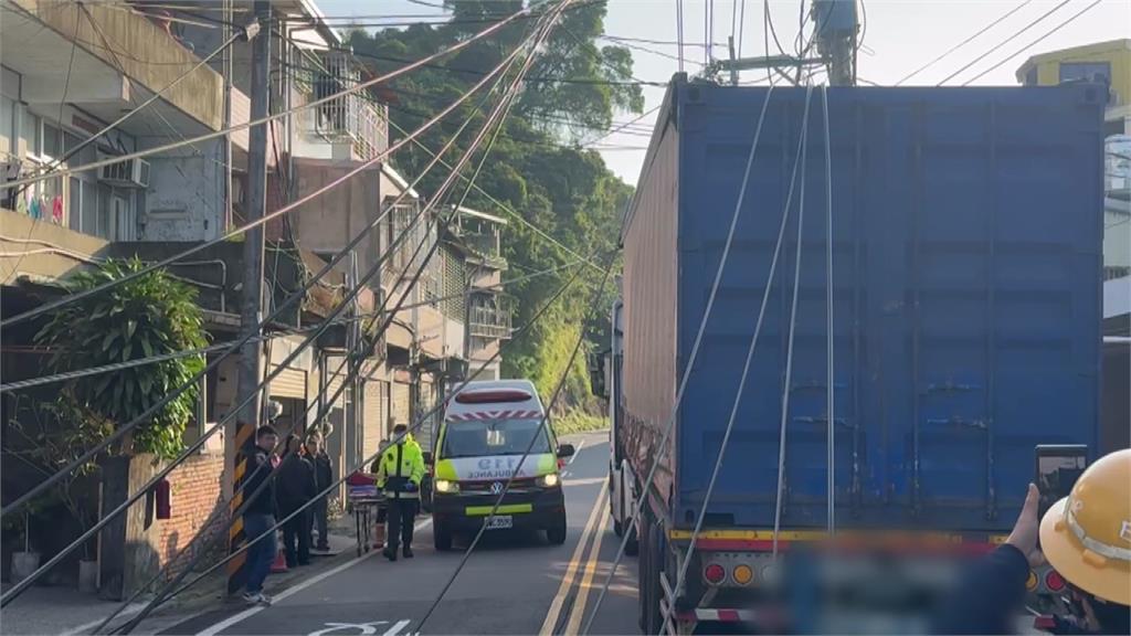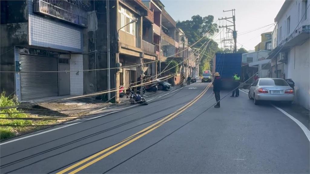 電線杆倒向對面鐵皮屋。圖/台視新聞 今(16)日上午7點多,一輛貨櫃車行經新北市三峽區正義街時,不慎勾到上方電線,導致電線桿倒塌,並倒在對向鐵皮屋頂上,現場電線散落一地。事故發生後,一名女騎士行經現場時,疑似沒注意到地面的電線而被絆倒,造成她手腳擦傷。消防人員獲報到場後,立即將她抬上擔架送往醫院治療。電線散落一地,造成一名女騎士絆倒受傷送醫。圖/台視新聞現場隨後拉起封鎖線進行搶修作業。這起事故也造成添福里、嘉添里等一帶約596戶停電,相關單位預計於下午5點完成修復。新北/綜合報導 責任編輯/周瑾逸
