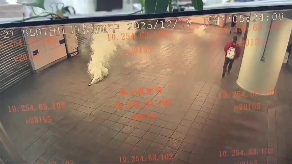 台北車站捷運站M7出口今(19)日遭人投擲煙霧彈,涉案男子頭戴防毒面具,拖著一只小型行李箱在台北車站捷運站沿途丟擲多顆煙霧彈,現場煙霧瀰漫,造成民眾恐慌,目前嫌犯仍在逃,北市警已全面追緝中。