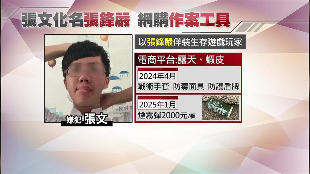 根據檢警偵辦發現,張文很狡猾,化名「張鋒嚴」佯裝成生存遊戲玩家,在網上大量採購作案工具,從去年4月開始透過露天、蝦皮等電商平台,陸續購買戰術手套、防毒面具、防護盾牌,今年1月更以每顆約2千元的價格購入煙霧彈,一口氣就買了24顆斥資4萬8千元。