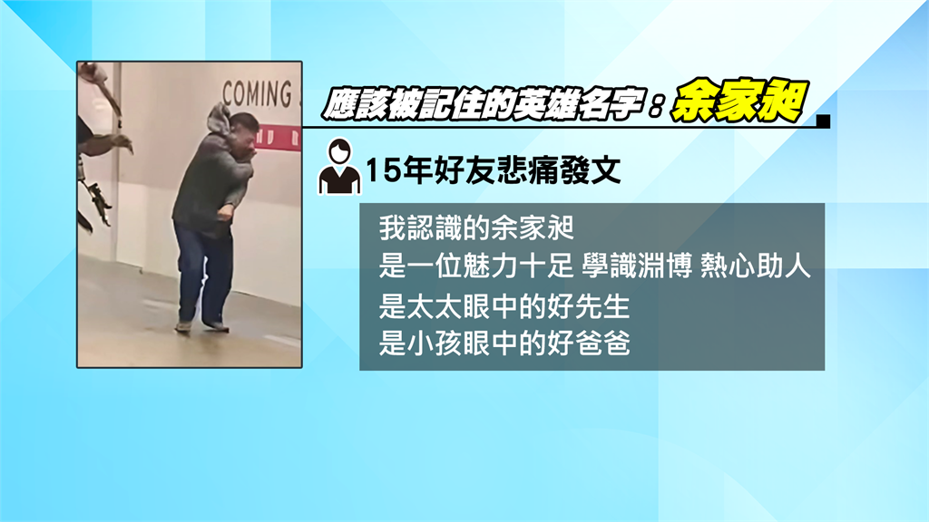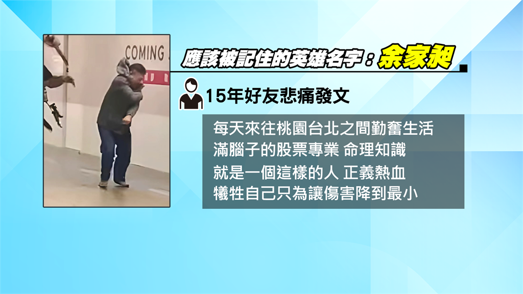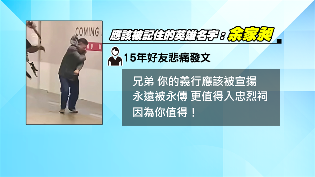 友人讚余家昶是好先生、好爸爸,值得入忠烈祠。圖/台視新聞當時就在附近的民眾也哀傷發文「余大哥救我一命」,網友更發文響應「應該被記住的英雄,名字就叫余家昶」,這份勇氣已經永遠留在台灣人心中。