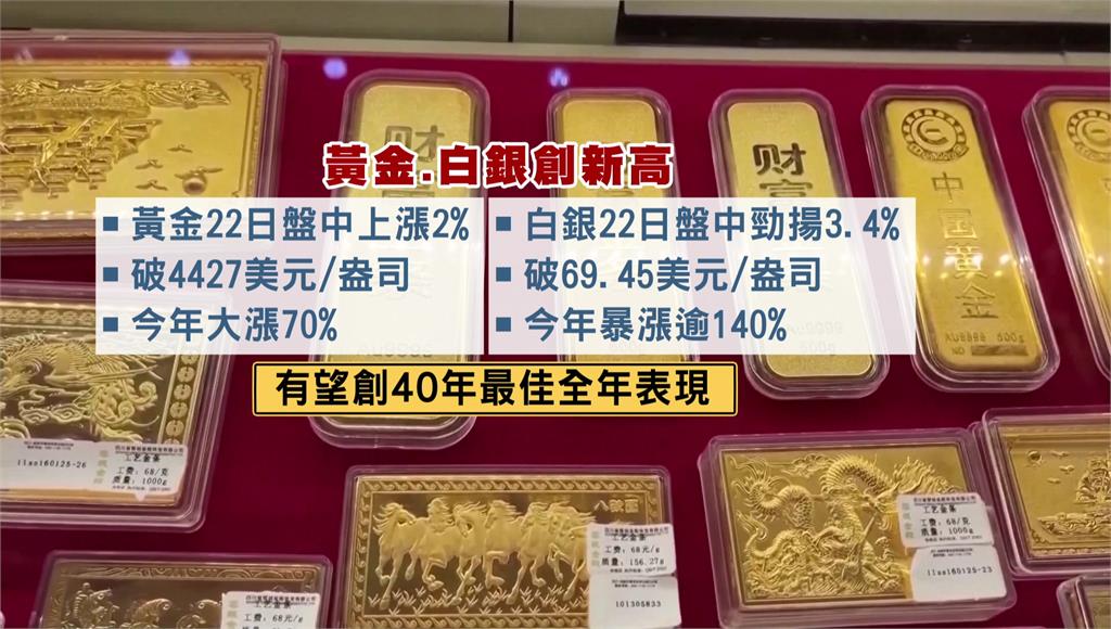 歲末年終,消費者紛紛來到銀樓選購金飾,今年金價持續創歷史新高,22日再度上漲2%,每盎司突破4427美元,今年已經大漲七成;白銀同樣銳不可擋,22日大漲超過3.4%,每盎司來到69.45美元,創歷史新高,今年已經暴漲超過140%,「黃金跟白銀都有望創下40年來全年最佳表現」。
