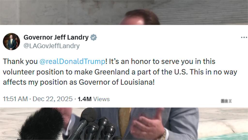 蘭德瑞發文。圖/翻攝自X@Governor Jeff Landry川普宣布消息後,蘭德瑞隨即在X平台上發文表示,很榮幸能協助川普,將格陵蘭納入美國,瞬間惹怒丹麥,丹麥外長拉斯穆森對美國舉措「深感憤怒」直言「我對(美國)任命這位特使感到非常不滿,尤其令我不滿的是,這位特使的發言完全不可接受。」