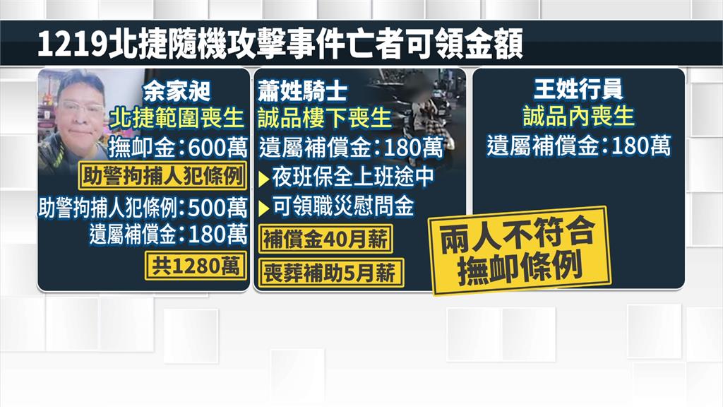 事發當日,余家昶在捷運站內奮勇對抗北捷惡嫌,北市依照幫助員警拘捕人犯條例,研擬給予最高600萬元撫恤金,加上場域捷運站保險理賠500萬,和遺屬補償金180萬,約可領到1280萬元。而在誠品樓下受害的蕭姓騎士,除了遺屬補償金之外,由於是夜班保全上班途中,可領到職災慰問金,包括補償金40個月月薪,以及喪葬補助5個月月薪;至於誠品內的王姓行員,則恐怕只能領到180萬元遺屬補償金,與蕭姓騎士兩人都不符合撫卹金條例。