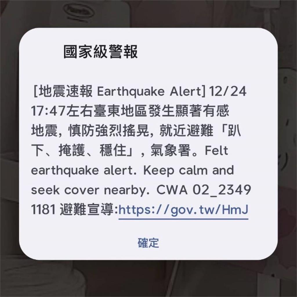 地震報告。圖/氣象署提供另外,地震當下氣象署有對全台19縣市發布「國家級警報」,包括花蓮縣、臺東縣、臺北市、新北市、桃園市、新竹市、新竹縣、苗栗縣、臺中市、南投縣、彰化縣、宜蘭縣、澎湖縣、雲林縣、嘉義市、嘉義縣、臺南市、高雄市、屏東縣,僅金門縣、連江縣未發布。