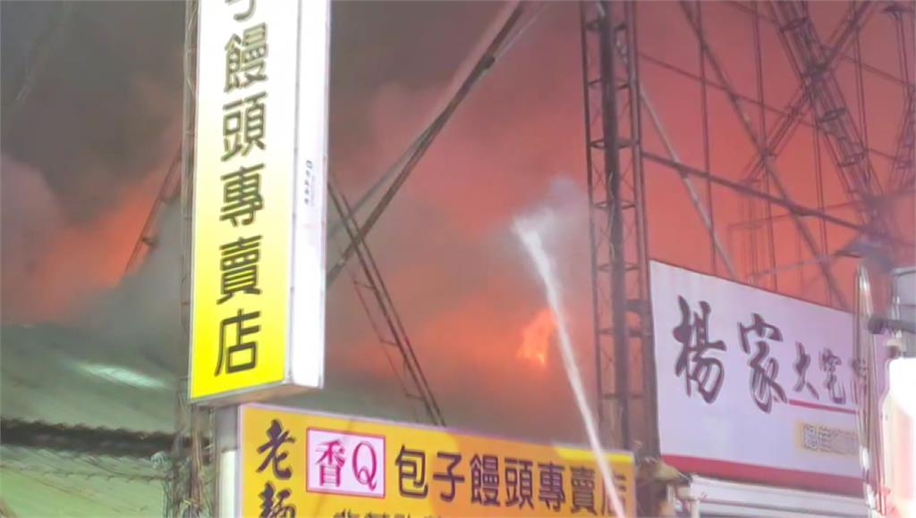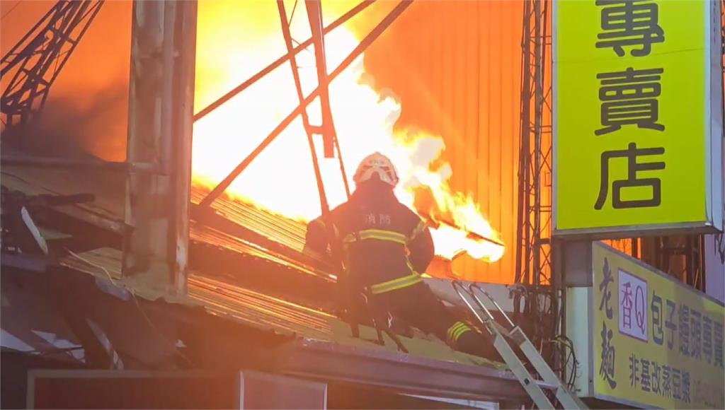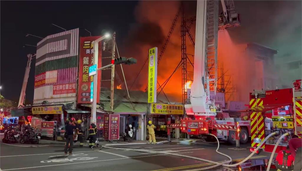 大火相當猛烈,延燒3間房屋。圖/台視新聞嘉義市中山路上一處鐵皮屋完全被大火包圍,烈焰沖天,消防緊急出動、佈水線灌救,還有消防人員透過雲梯爬上鐵皮屋頂,踩在上方救火,場面相當驚險。這場大火也聚集不少民眾關切,其中就包含被波及的饅頭店老闆、老闆娘。