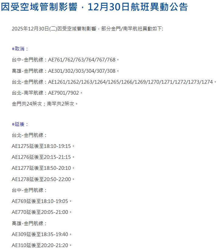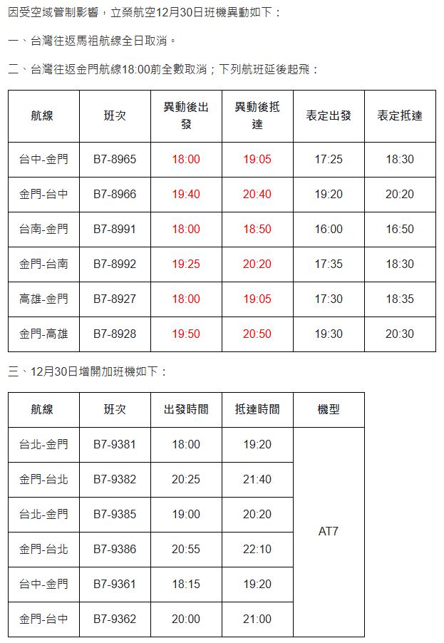立榮航空公告,因受空域管制影響,12月30日台灣往返馬祖航線全日取消;台灣往返金門航線18:00前全數取消,有6航班則延至18:00後起飛,另外18:00後還會加開6班次。