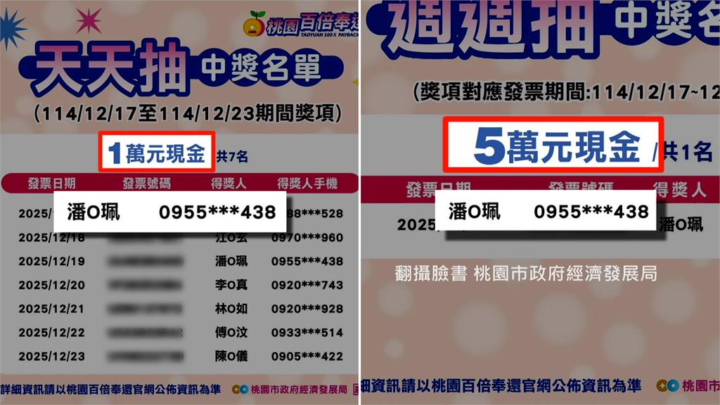 桃園「百倍奉還」抽獎 同人連續中獎1萬和5萬