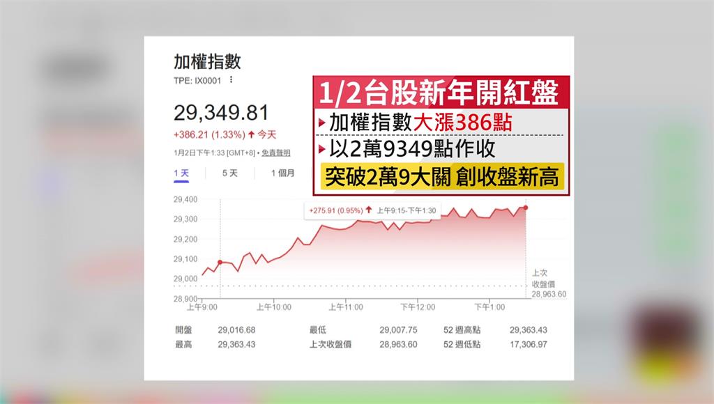 不只金融整併寫下新頁,資本市場同樣氣勢如虹,台股在2026年首個交易日開出亮眼紅盤,加權指數大漲386點,突破2萬9千點大關,也創下收盤新高。