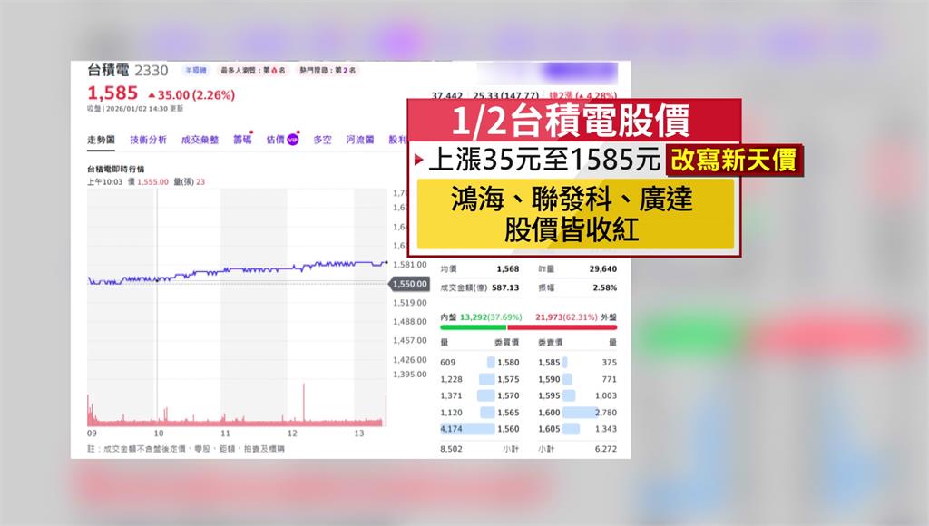 1/2台積電股價上漲35元至1585元,改寫新天價。圖/台視新聞