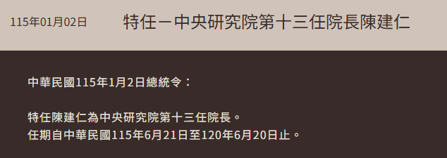 總統府頒布總統令,特任陳建仁擔任第十三任中央研究院院長。圖/翻攝自總統府官網現任院長廖俊智任期將於6月屆滿,中研院召開第25屆評議會,順利選出前三名候選人,包括陳建仁、中研院副院長周美吟,以及中研院院士朱敬一,名單函報總統府後,由總統賴清德親自任命。